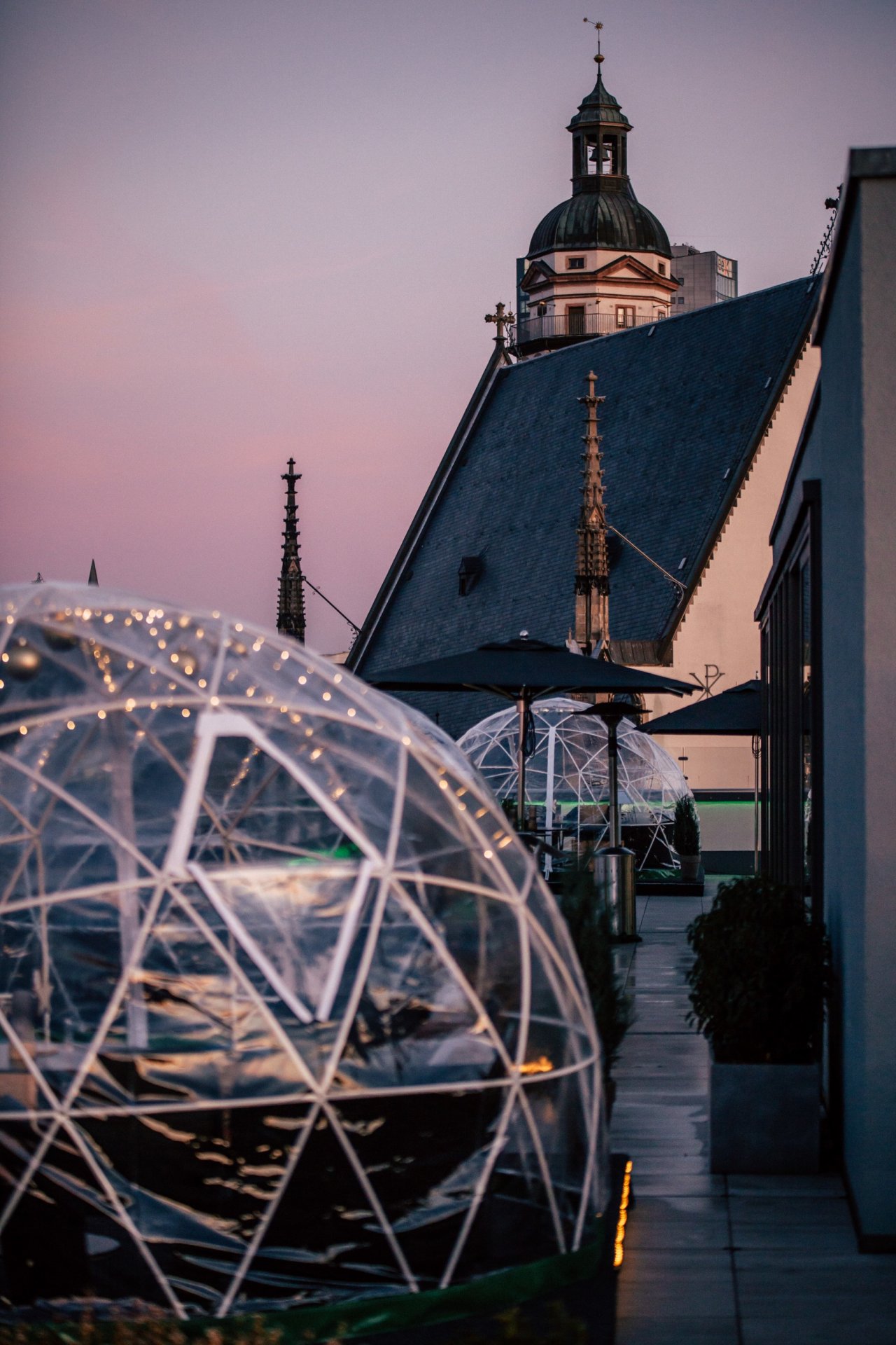Genießen Sie die winterliche Atmosphäre unserer Dachterrasse und den Ausblick auf die Dächer der Stadt sowie die berühmte Thomaskirche. Reservieren Sie einen unserer 9 beheizten Iglus für jeweils bis zu 6 Personen. Unsere beheizten Iglus sind mit einem großen Massivholztisch, bequemen Stühlen, gemütlichen Fellen und liebevoller Deko ausgestattet.